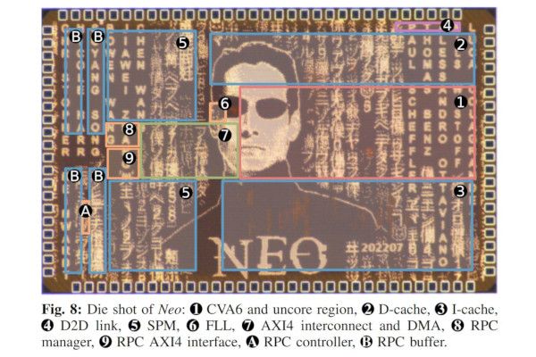 "Cheshire is a lightweight and modular 64-bit Linux-capable host platform designed for the seamless plug-in of domain-specific accelerators," the PULP team explains of the technology inside Neo. "It features a unique low-pin-count DRAM interface, a last-level cache configurable as scratchpad memory, and a DMA engine enabling efficient data movement to or from accelerators or DRAM. It also provides numerous optional IO peripherals including UART, SPI, I2C, VGA, and GPIOs.