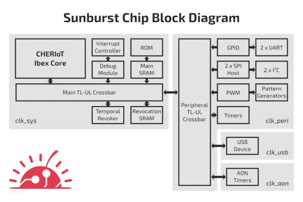 The Sunburst Chip repository contains an open-source microcontroller implementation of CHERIoT-Ibex, which places the CHERI technology into the Ibex RISC-V core. At the time of writing, it included both the logical design along with a design verification environment and associated bare-metal test software - all published under the permissive Apache 2.0 licence.